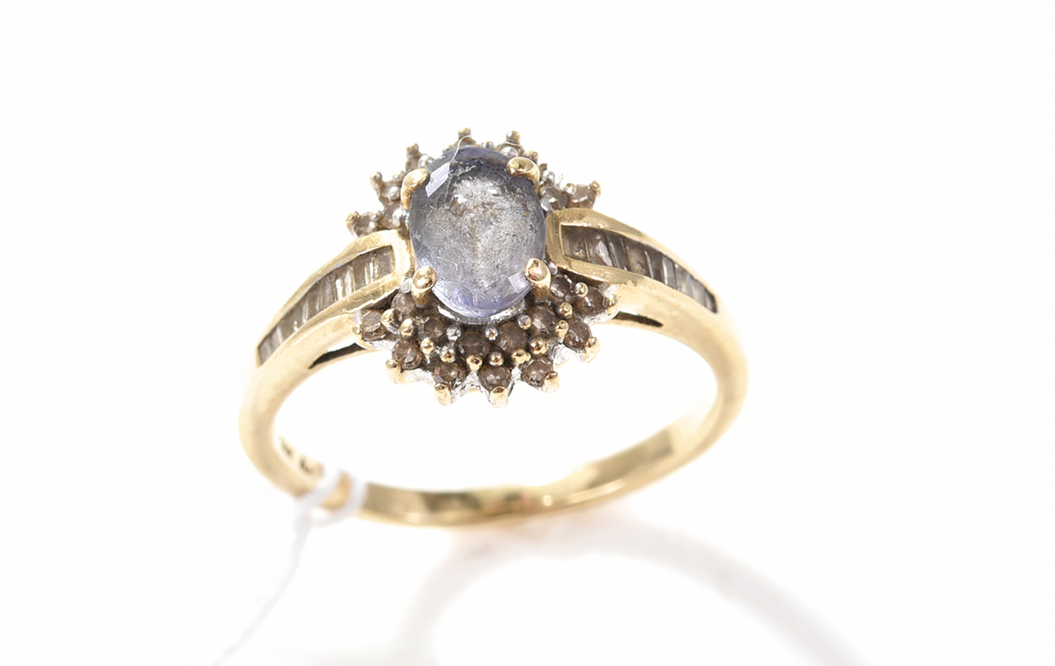 A TANZANITE AND DIAMOND CLUSTER RING IN 14CT GOLD.
