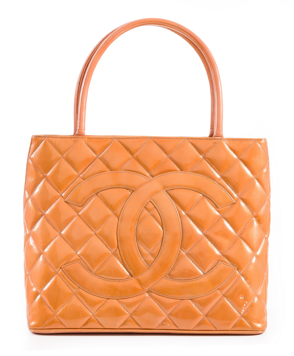 Styled in quilted peach patent leather, 24.5 x 29.5 x 14.5cm.