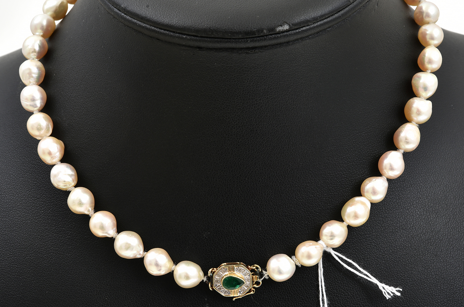 A STRAND OF PEARLS TO AN EMERALD AND DIAMOND SET CLASP.