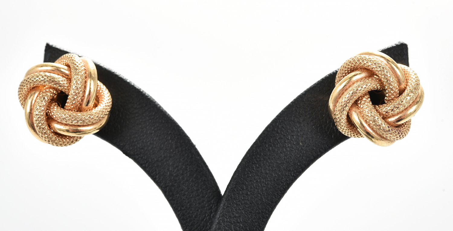 A PAIR OF ITALIAN KNOT EARRINGS IN 9CT GOLD.
