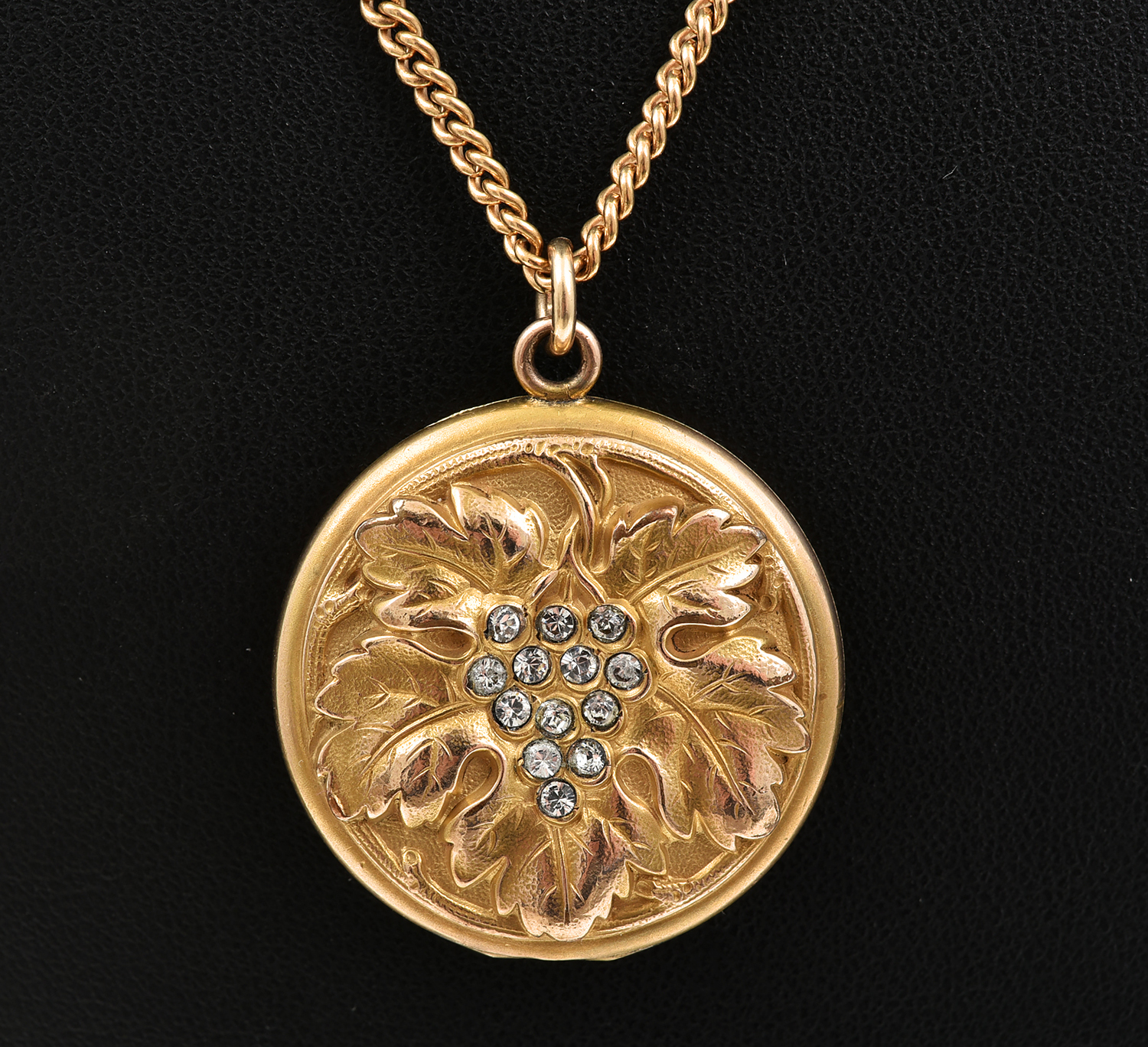 AN ANTIQUE STONE SET PENDANT TO A DISPLAY CHAIN.