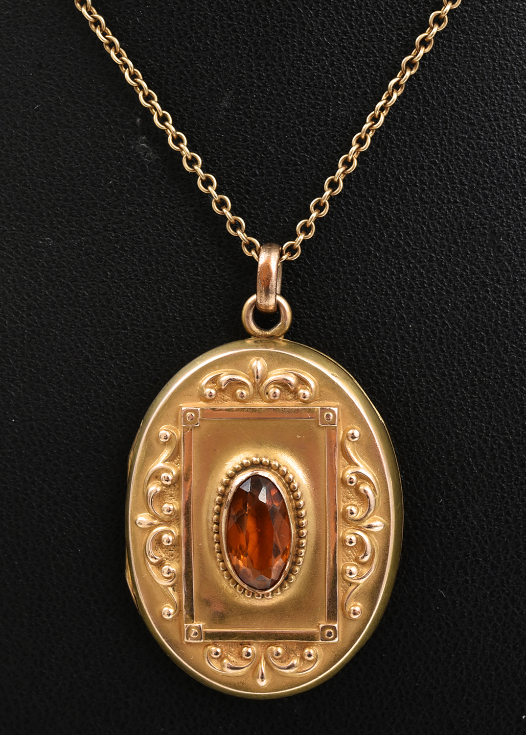 AN ANTIQUE CITRINE SET LOCKET, GOLD LINED.