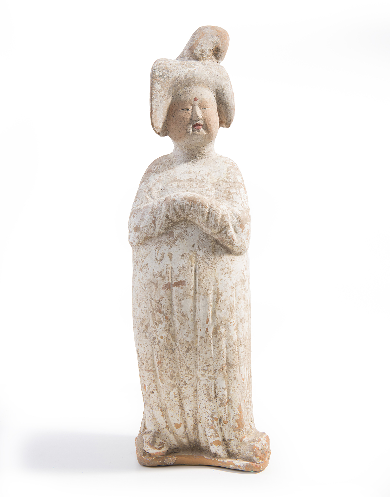 The terracotta earthenware figure modelled as a court lady standing with arms folded, with finely modelled facial features and a large coiffure, her body covered in flowing robes. With remnant original gesso and paintwork.