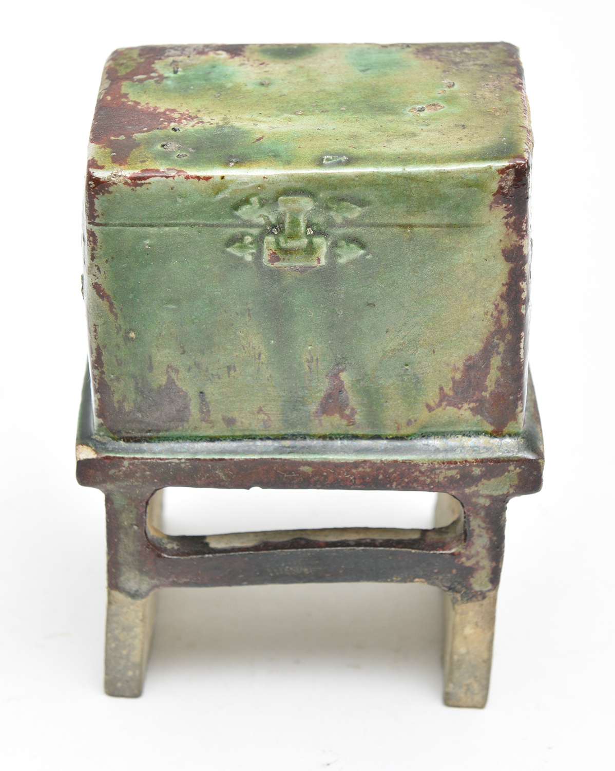 Modelled as a chest on a recessed leg table, in lead-glazed earthenware. Fitted cloth-covered box.