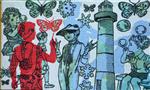 DAVID BROMLEY, FIGURES AND LIGHT HOUSE, EMBROIDERY ON CANVAS, 23 X 34 CM