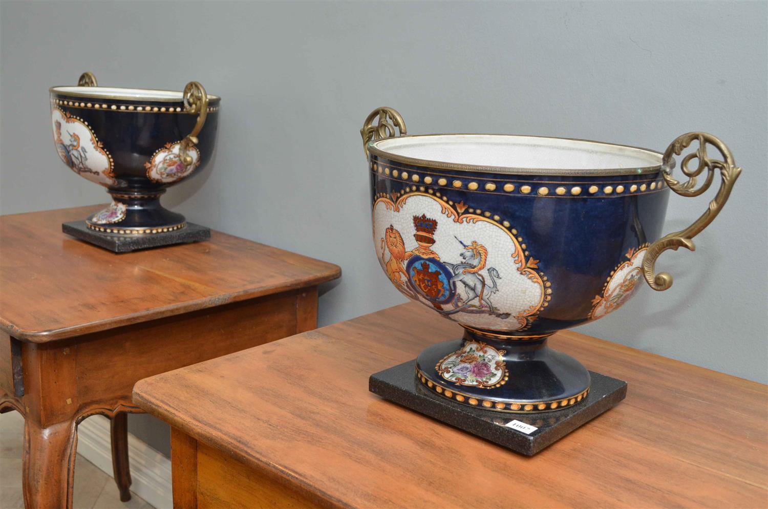 TWO FRENCH STYLE CERAMIC CENTERPIECES ON MARBLE BASES