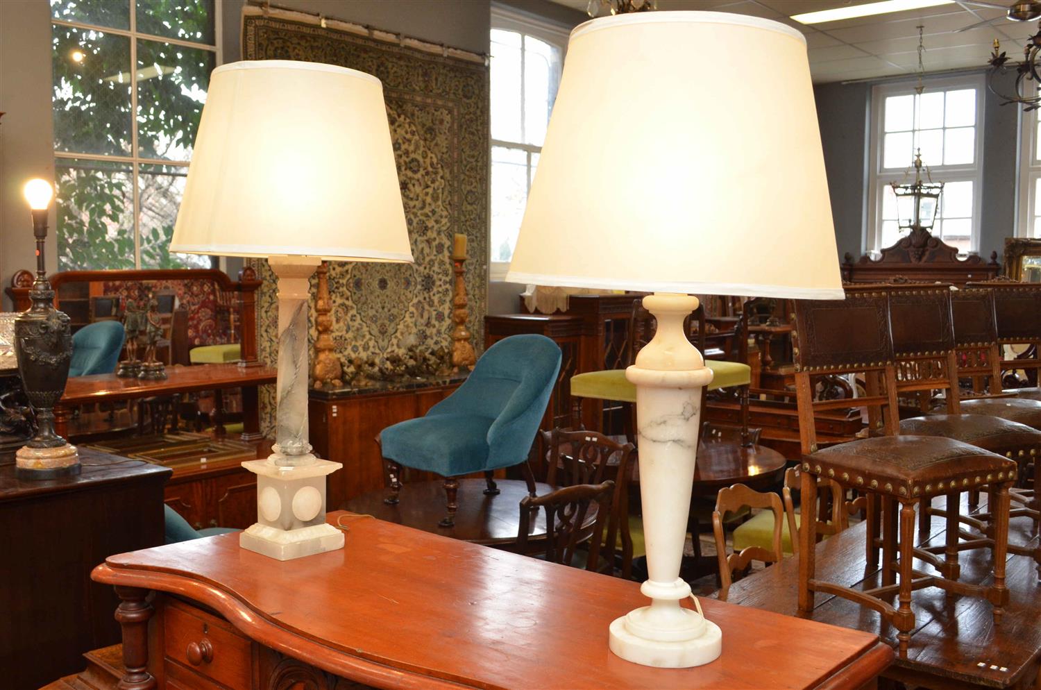 AN ALABASTER COLUMN LAMP AND A MARBLE LAMP, BOTH WITH SHADES