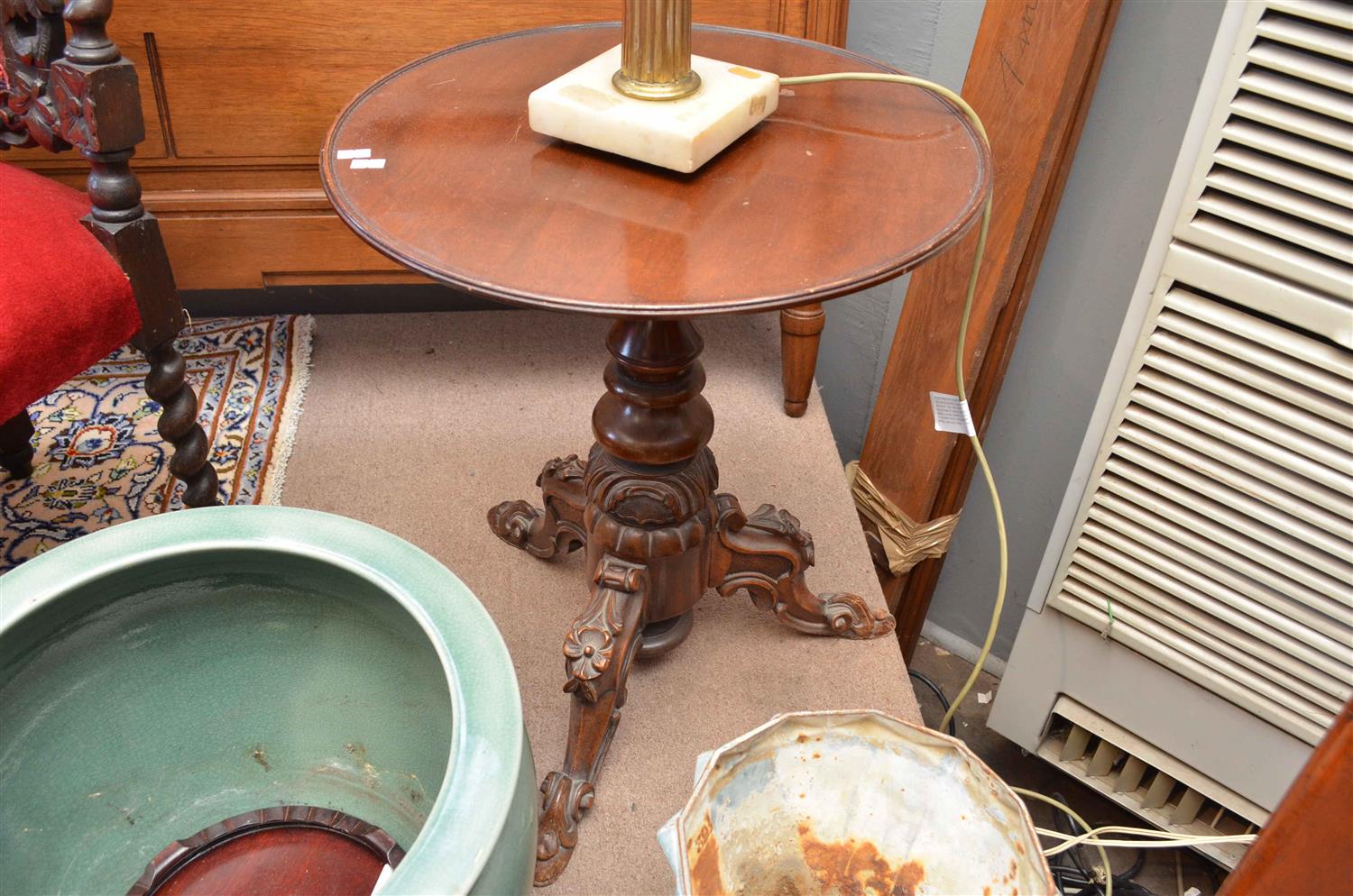 A VICTORIAN MAHOGANY WINE TABLE ON CARVED TRIPOD BASE