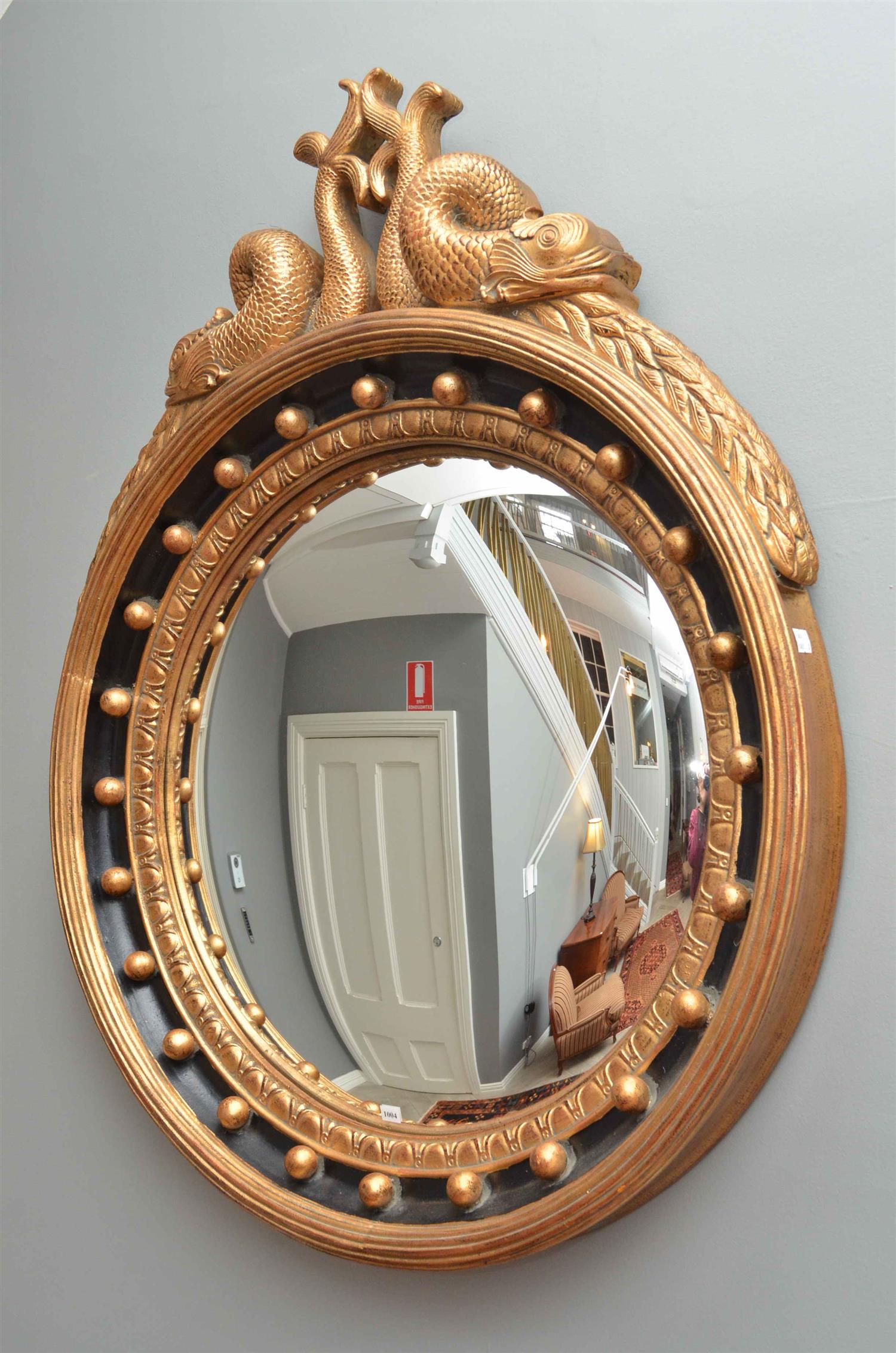 A LARGE AND IMPRESSIVE FRENCH EMPIRE STYLE GILT FRAMED CIRCULAR CONVEX MIRROR (130H X 100W CM)
