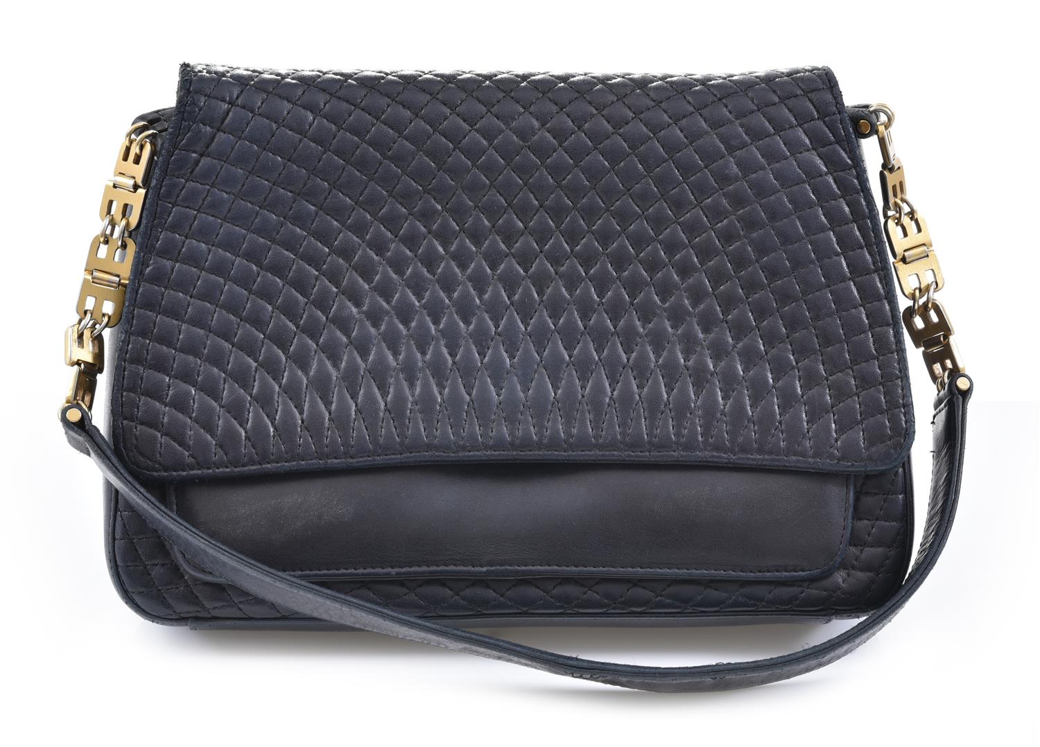 Styled in navy quilted leather with gold metal and leather handle, 18 x 26 x 5cm.