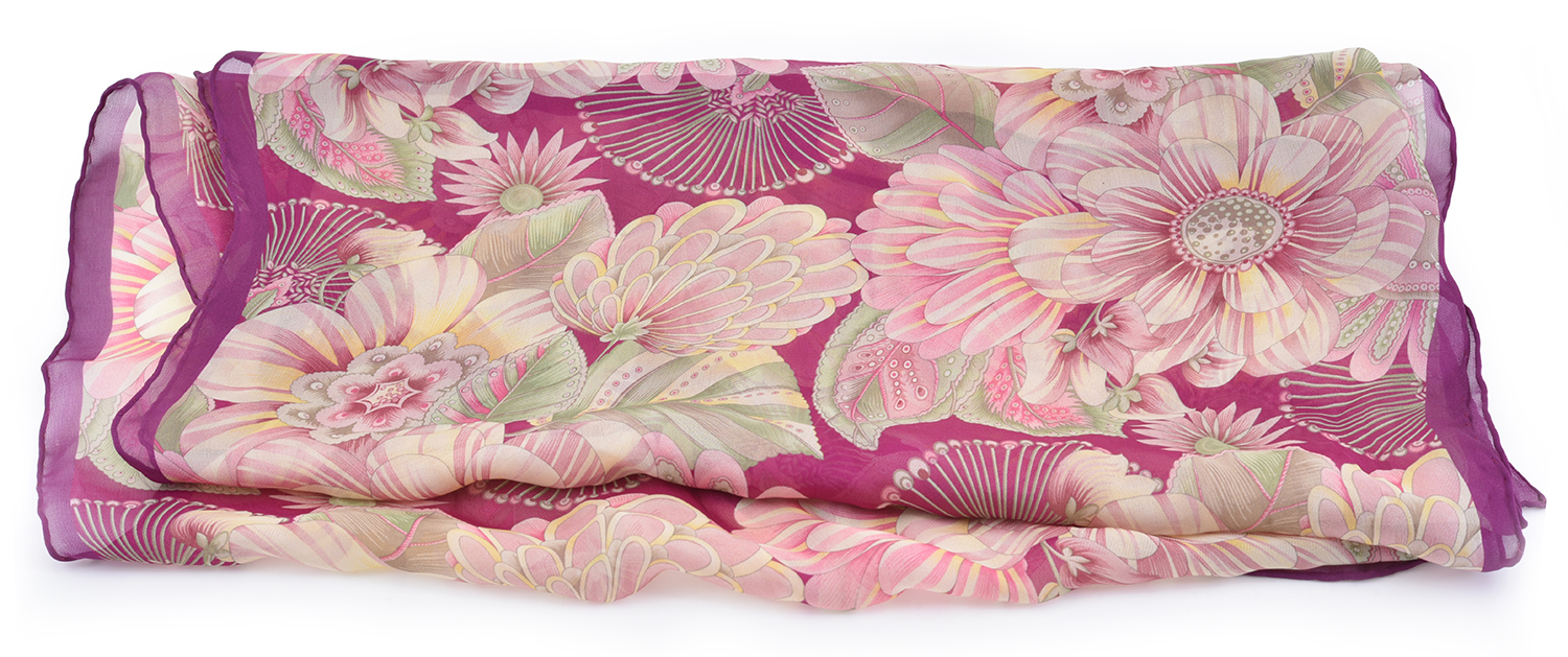 Styled with a floral print with a purple border, 42 x 155cm.