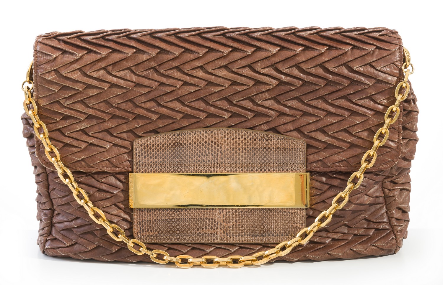 Styled in brown folded leather with snakeskin and gold clasp and gold chain strap, 22 x 32 x 6cm.