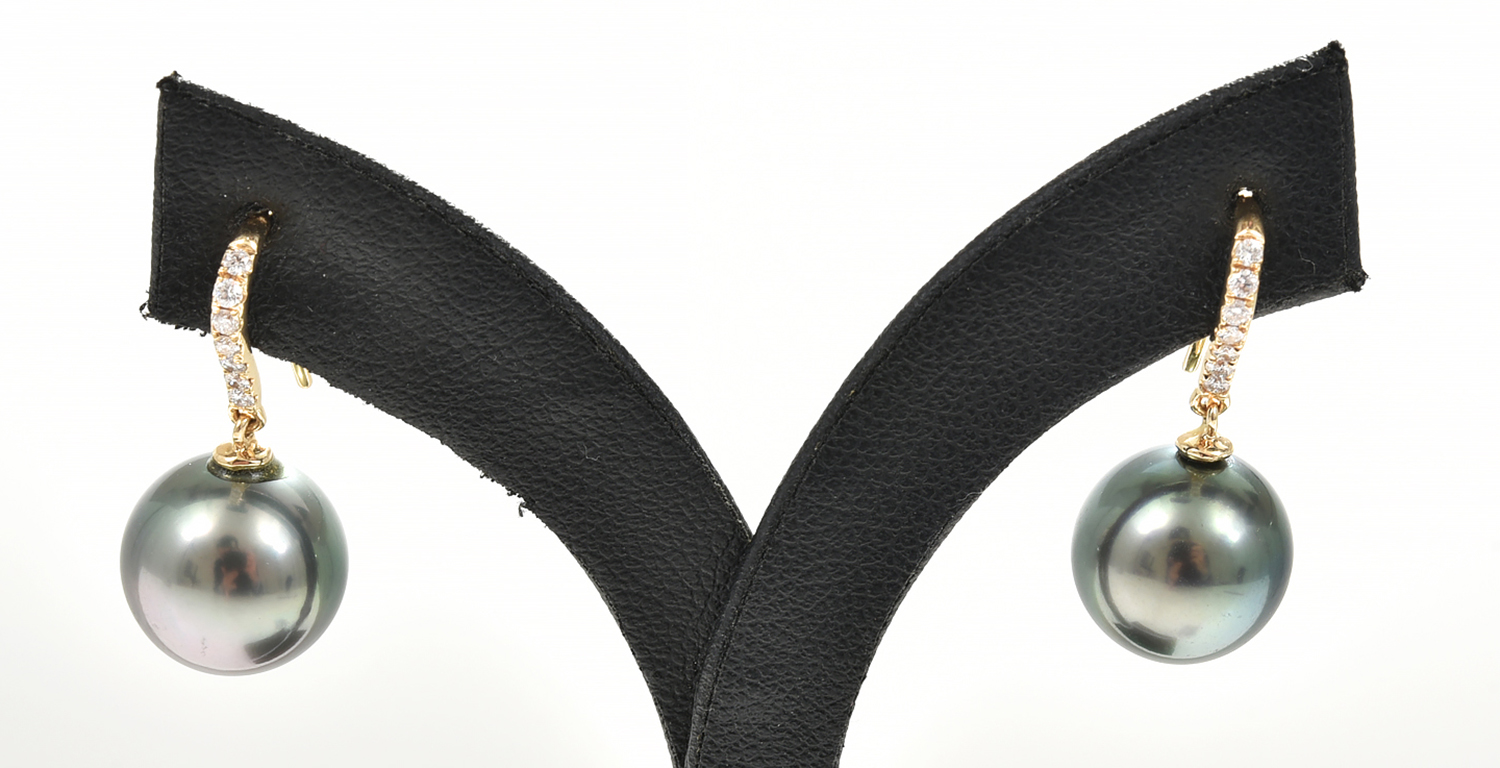 A PAIR OF TAHITIAN PEARL EARRINGS WITH DIAMOND SET HOOKS IN 18CT GOLD