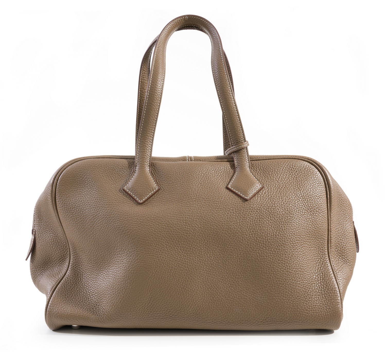 Styled in etoupe togo leather with contrast white stitching, and palladium metal hardware, 22 x 35 x 17cm.