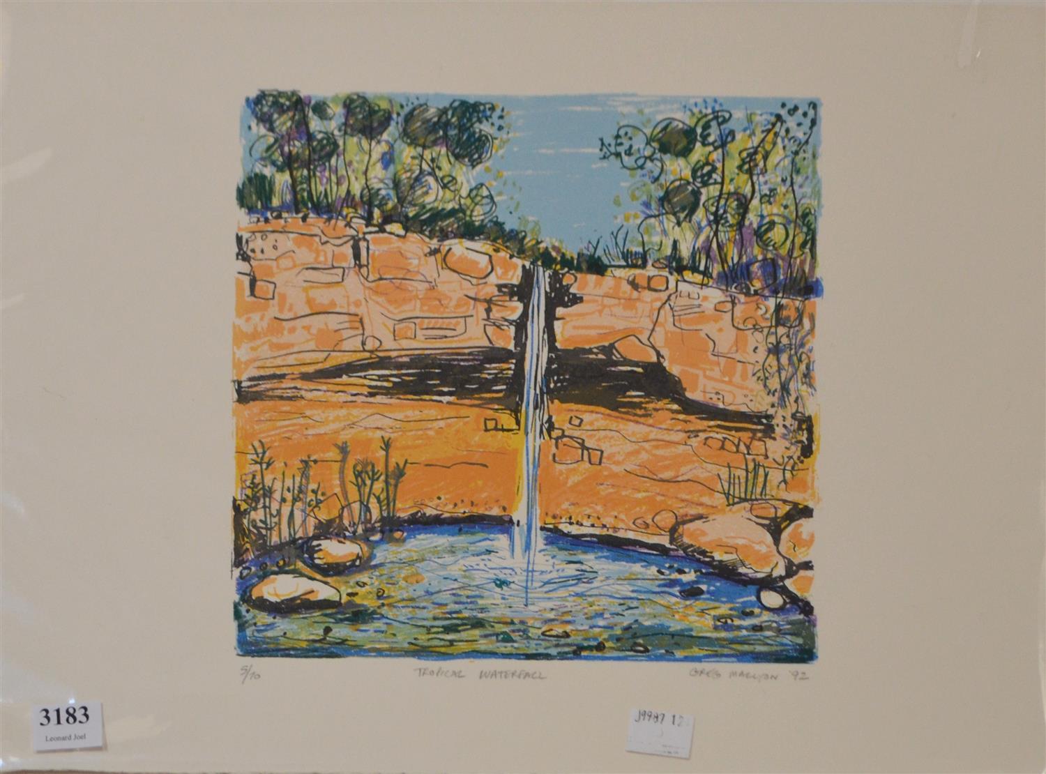 GREG MALLYON, TROPICAL WATERFALL, SCREEN PRINT 5/70, 20 X 21CM, CONDITION: VERY GOOD, THIS WORK IS UNFRAMED HOWEVER BACKED AND WRAPPED IN PLASTIC