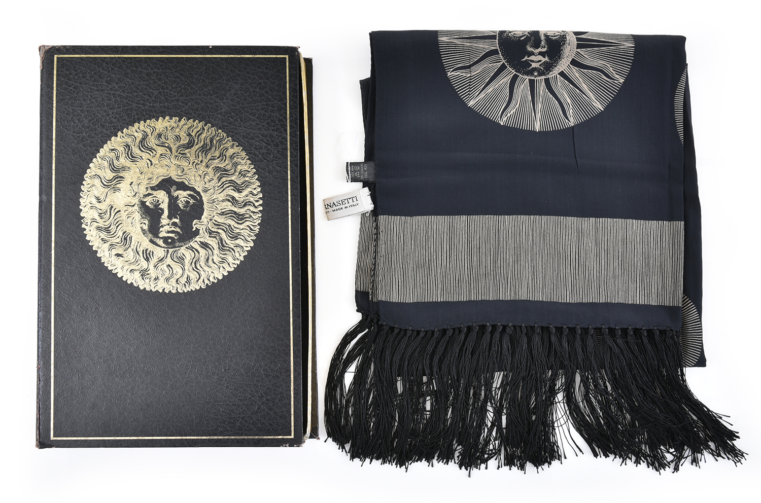 Styled with a celestial print on a black background, with fringed edges, 48 x 148cm, boxed.