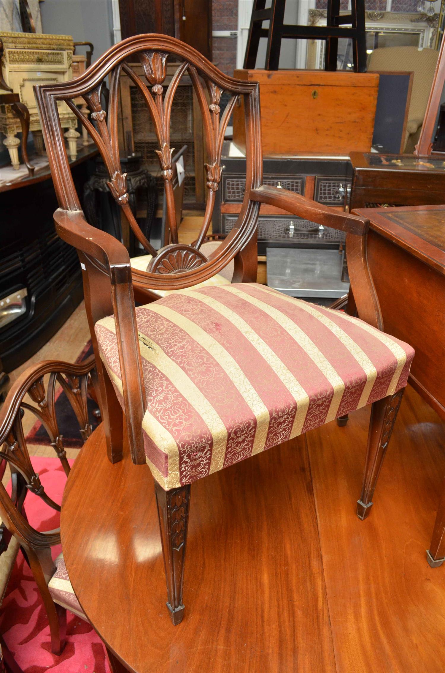 A SET OF EIGHT HEPPLEWHITE STYLE DINING CHAIRS (INCLUDING TWO CARVERS - DAMAGE TO UPHOLSTERY)