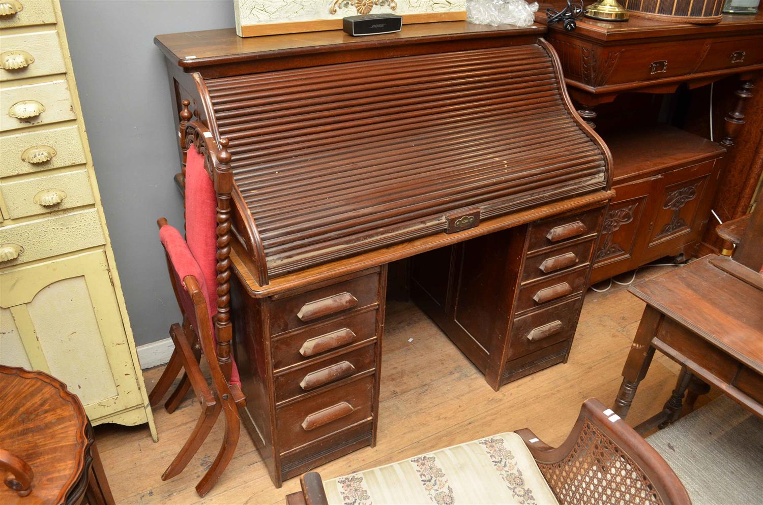A 1920'S OAK ROLL TOP DESK (LOCK IN OFFICE WITHOUT KEY)