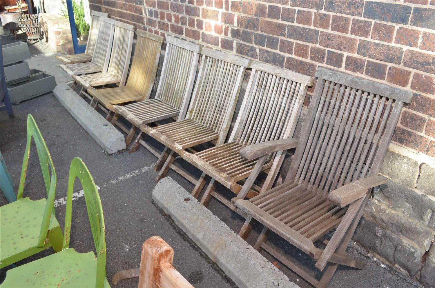 EIGHT TEAK FOLDING CHAIRS INCLUDING ONE CARVER