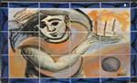 ARTIST UNKNOWN (SIGNED ILLEGIBLY), FIGURE IN LANDSCAPE, MOSIAC, 73 X 94CM