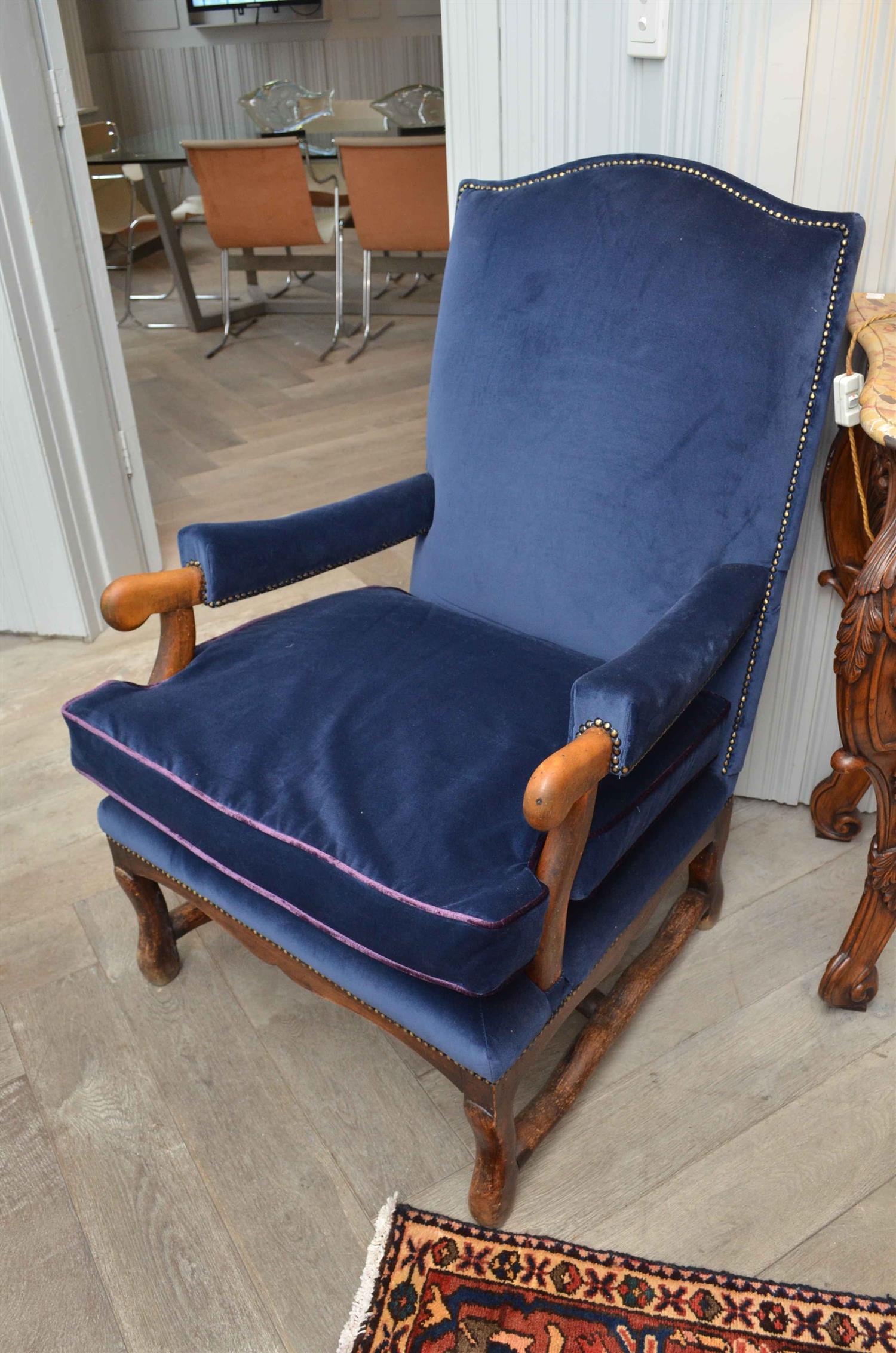 TWO WILLIAM AND MARY STYLE ARMCHAIRS IN BLUE VELOUR UPHOLSTERY