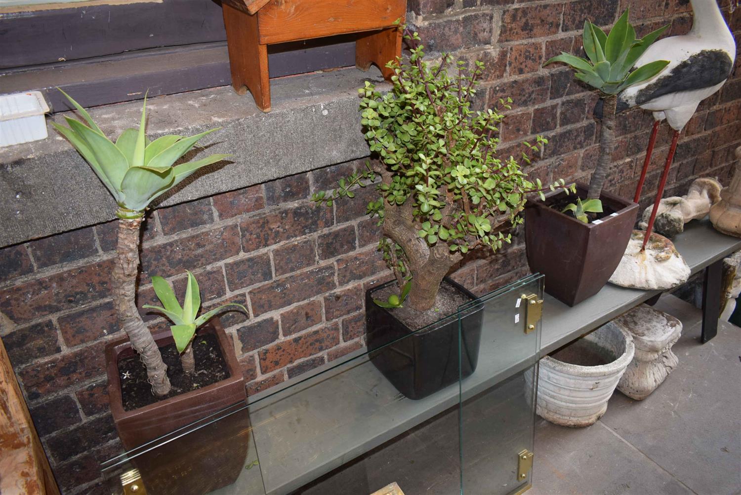 FOUR POTTED PLANTS INCLUDING TWO YUCCA, AND TWO MONEY TREES