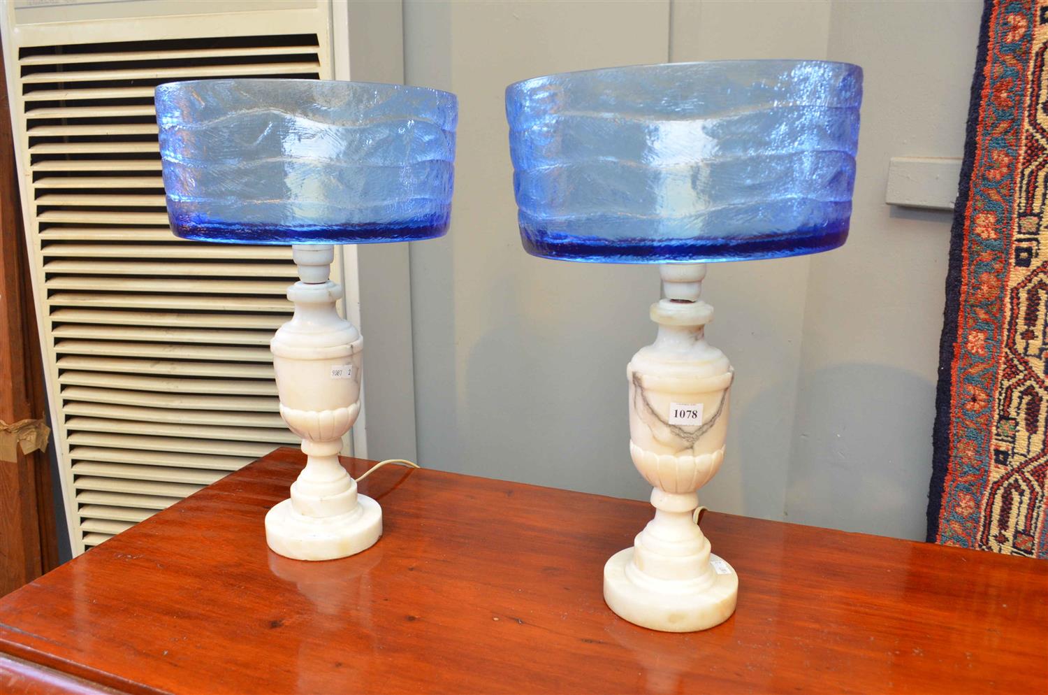 A PAIR OF CLASSICAL STYLE SOLID MARBLE DESK LAMPS WITH MODERN BLUE PLASTIC SHADES