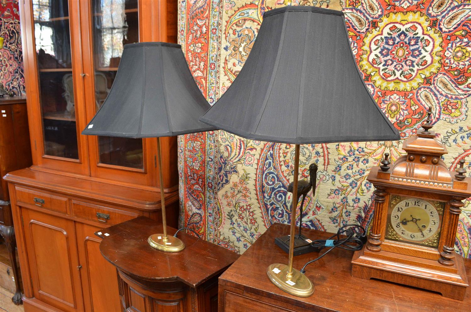 A PAIR OF SLIM BRASS DESK LAMPS WITH BLACK SHADES