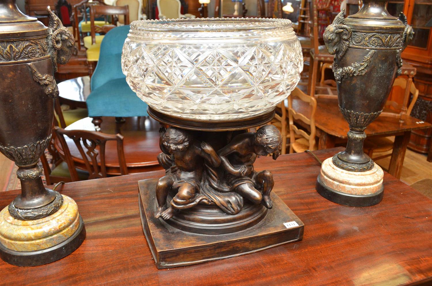 A DECORATIVE CAST BRONZE FIGURAL PEDESTALL WITH CRYSTAL BOWL