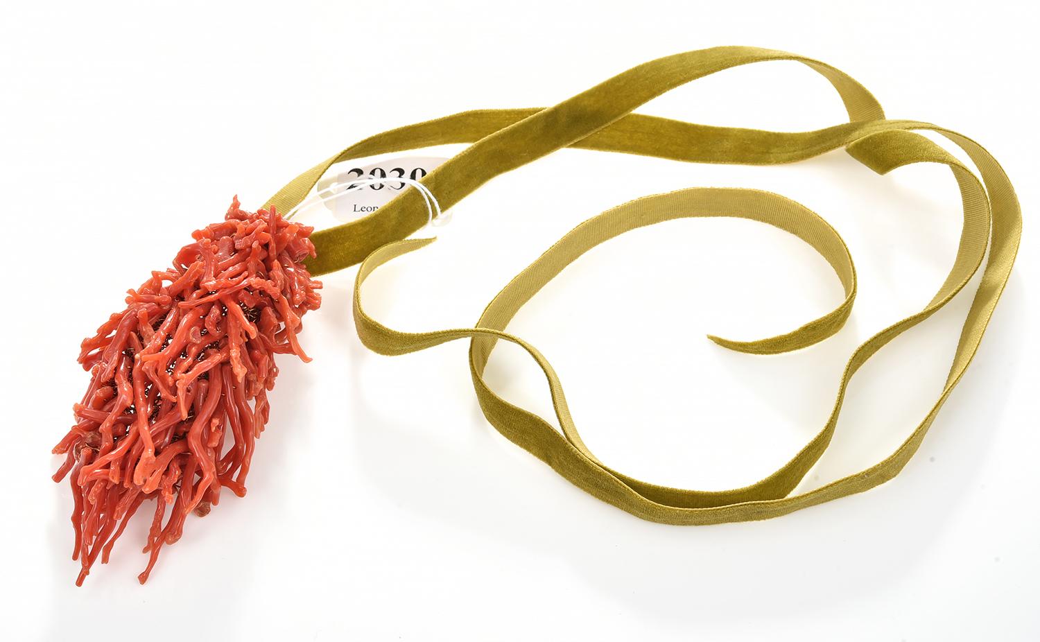 A HANDMADE CORAL CLUSTER PENDANT TO A VELVET CORD