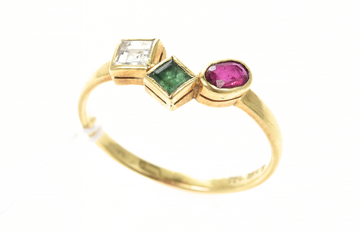 A DIAMOND, EMERALD AND RUBY RING IN 18CT GOLD