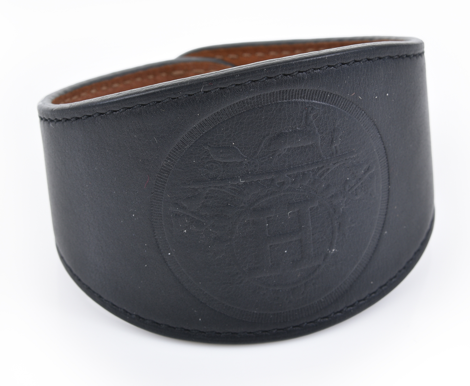 Styled in black leather with Hermes crest embossed to front and silver metal clasp.