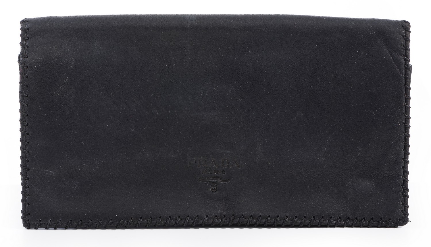 Styled in black suede and leather with whip stitch edge, 12 x 20.5cm, boxed.