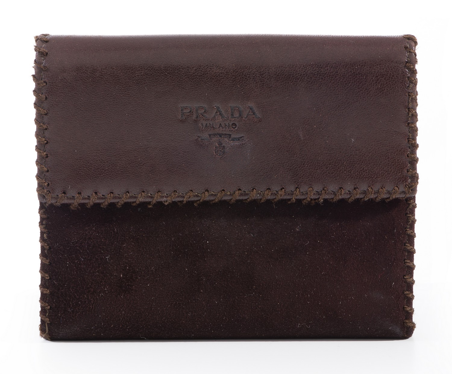 Styled in brown suede and leather with whip stitch edge, 11 x 13 x 1cm, boxed.