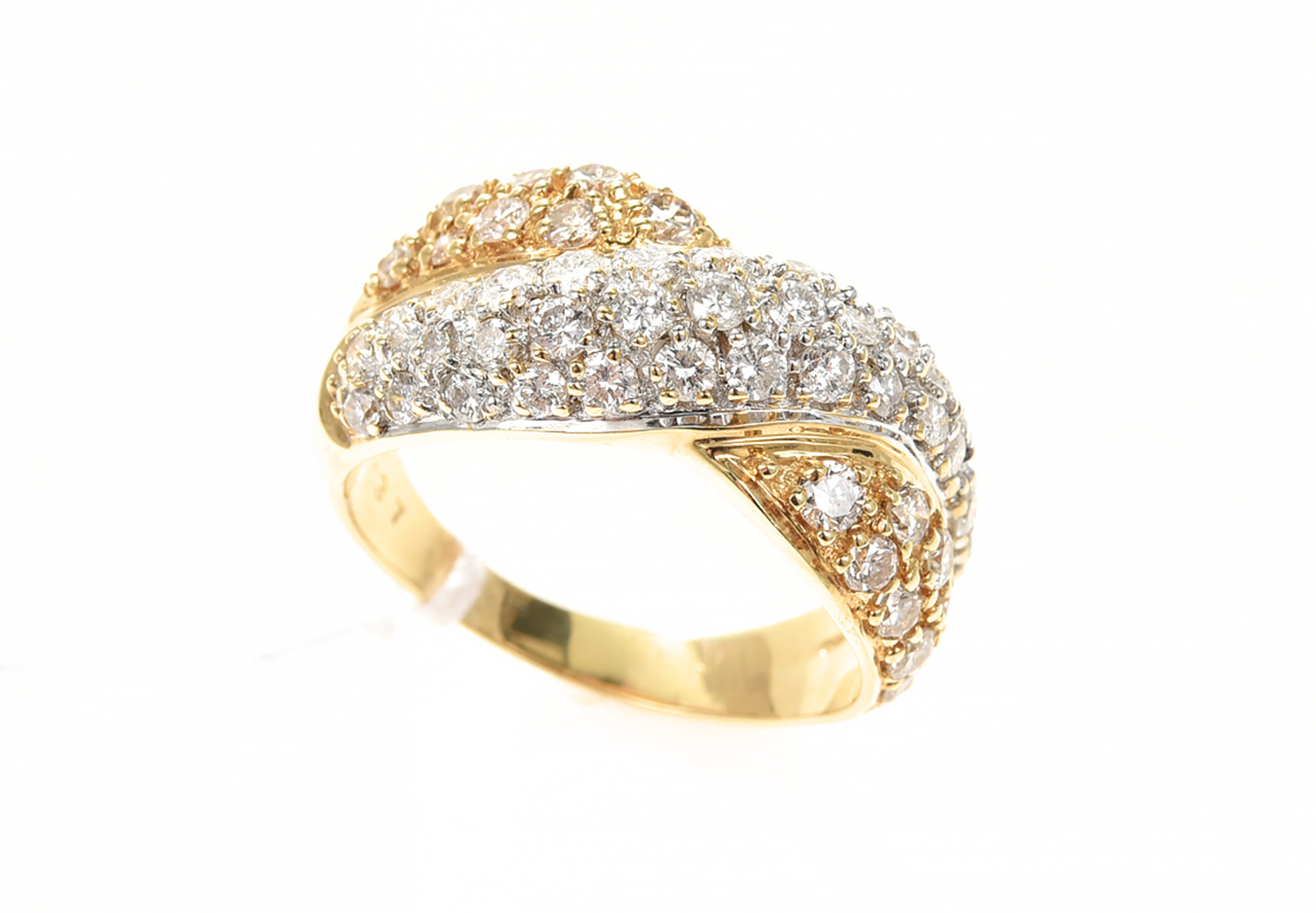 A DIAMOND CROSSOVER RING IN TWO TONE 18CT GOLD, DIAMOND TOTALLING 1.37CTS