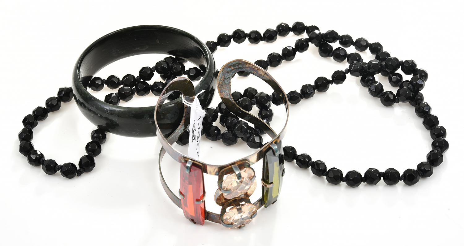 A GEM SET BRACELET IN SILVER WITH A FRENCH SET NECKLACE AND A BANGLE