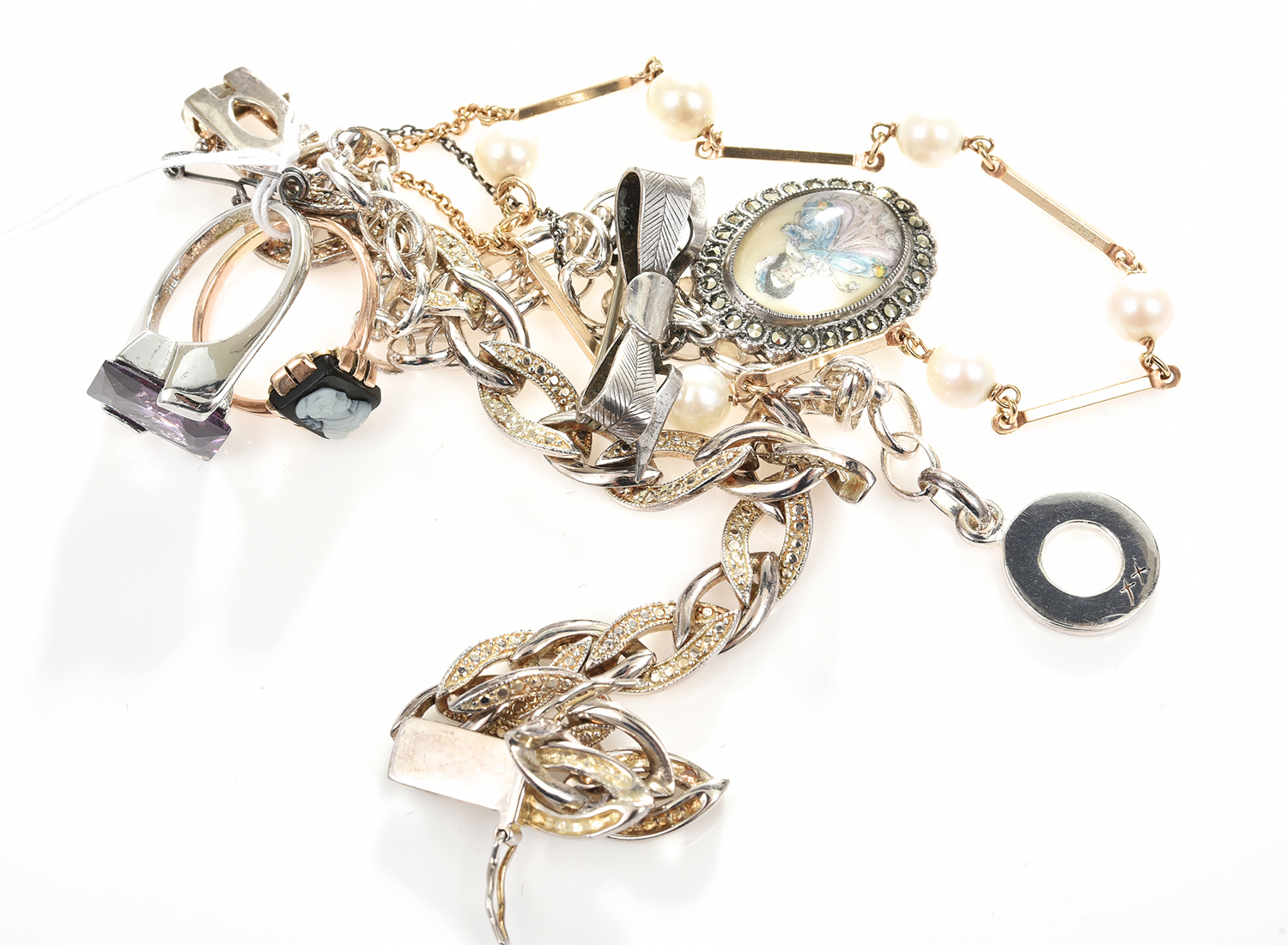 A COLLECTION OF VINTAGE JEWELLERY INCLUDING A CAMEO RING AND A PEARL BRACELET