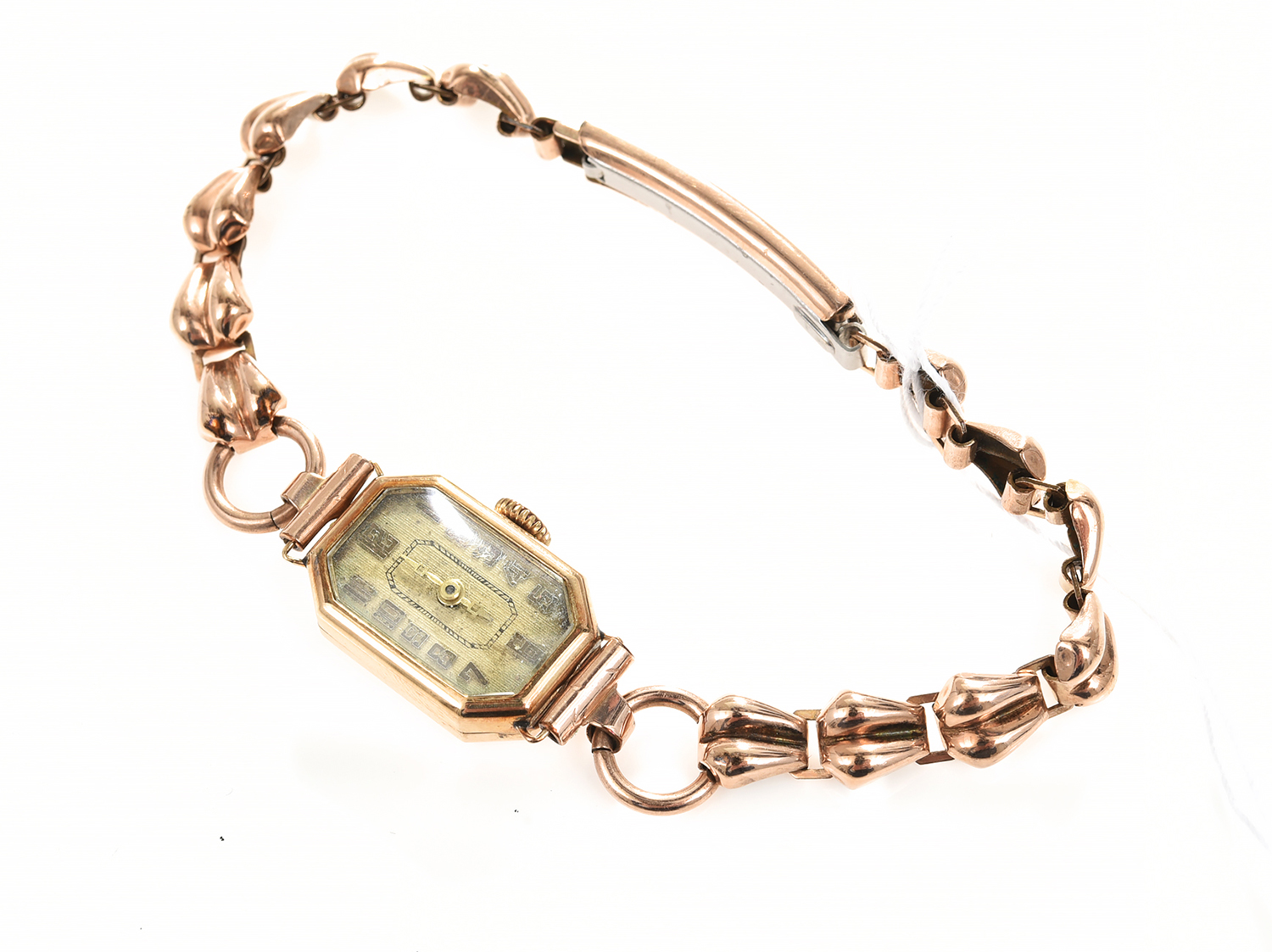 AN ART DECO LADY'S WRISTWATCH IN 14CT GOLD AND A GOLD PLATED BAND