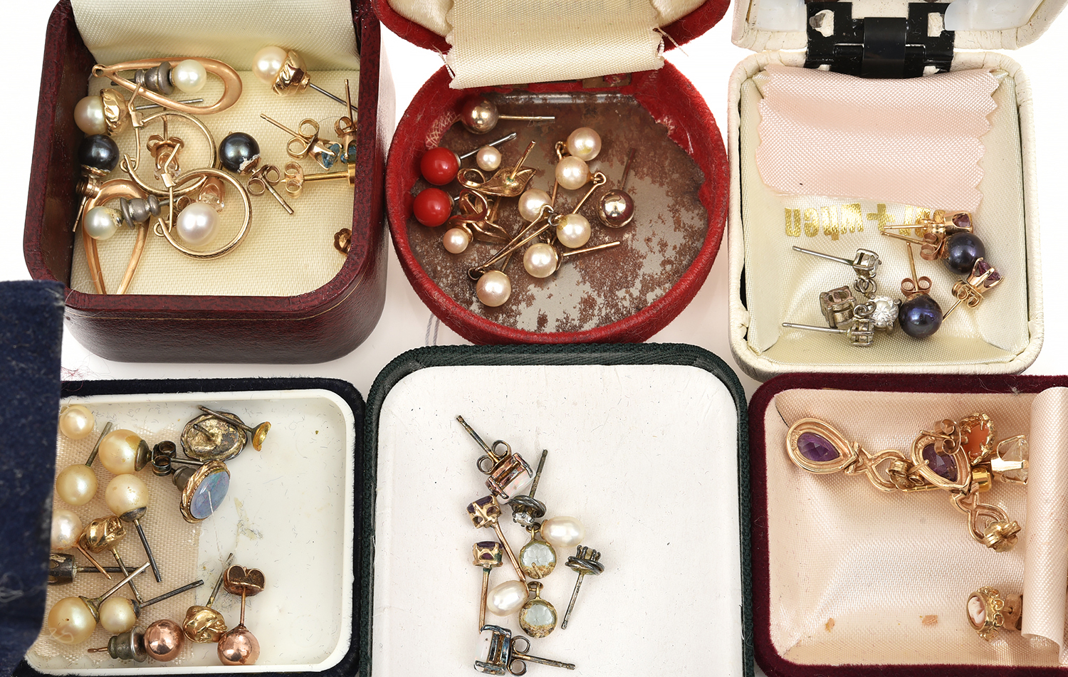 A BOX OF STUD EARRINGS INCLUDING OPAL, GOLD, COSTUME AND CAMEO