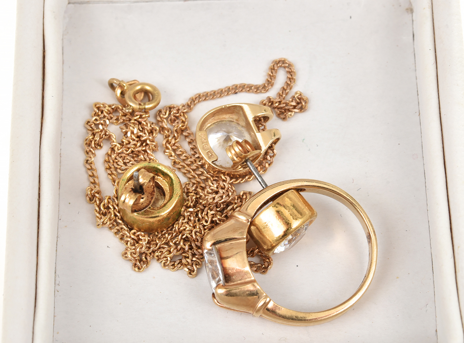 A CUBIC ZIRCONIA SUITE IN 14CT GOLD INCLUDING A RING, A PENDANT AND A PAIR OF EARRINGS IN GOLD PLATE