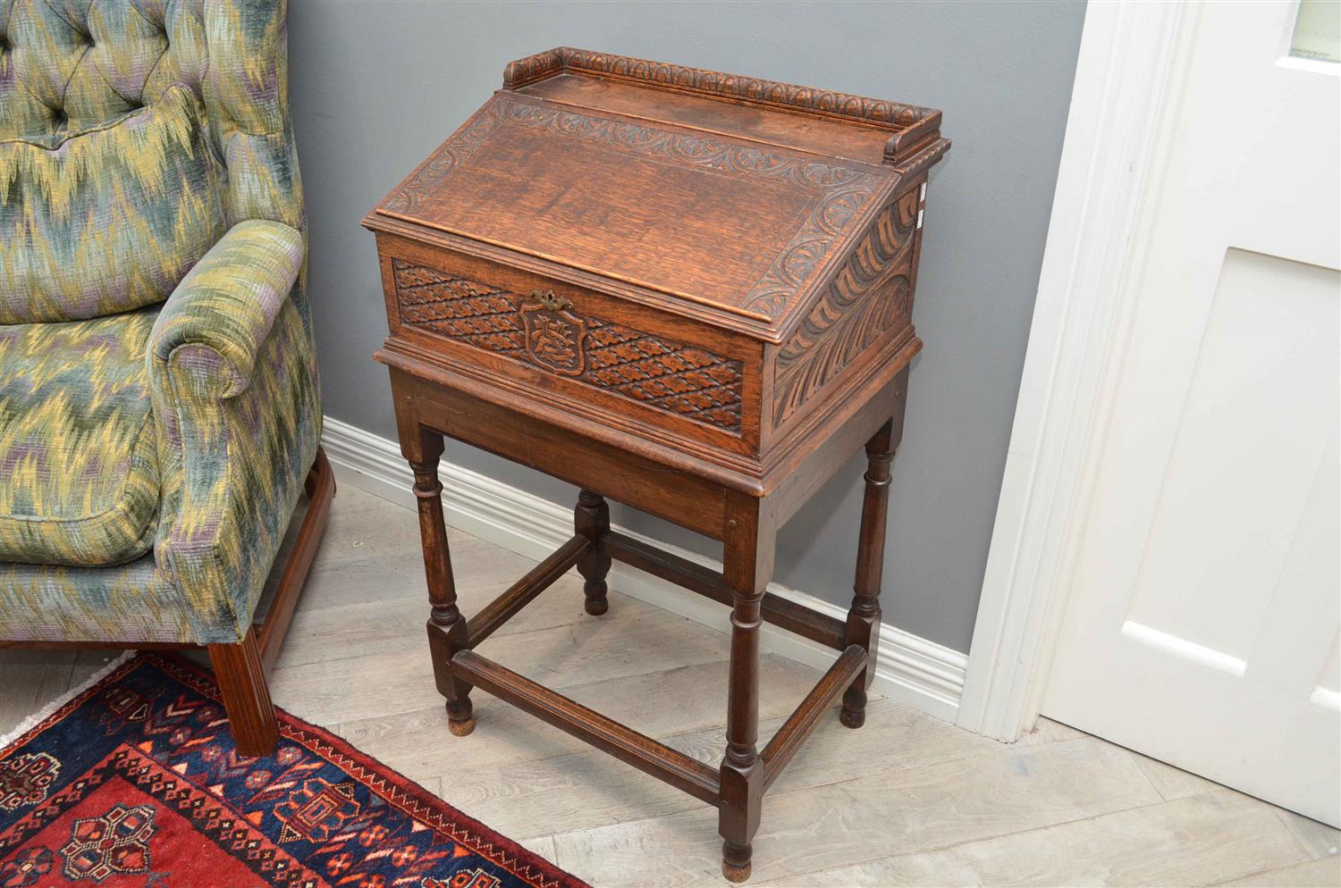 A 19TH CENTURY CARVED ENGLISH OAK WRITING SLOPE WITH LIFT TOP AND INTERNAL DRAWERS