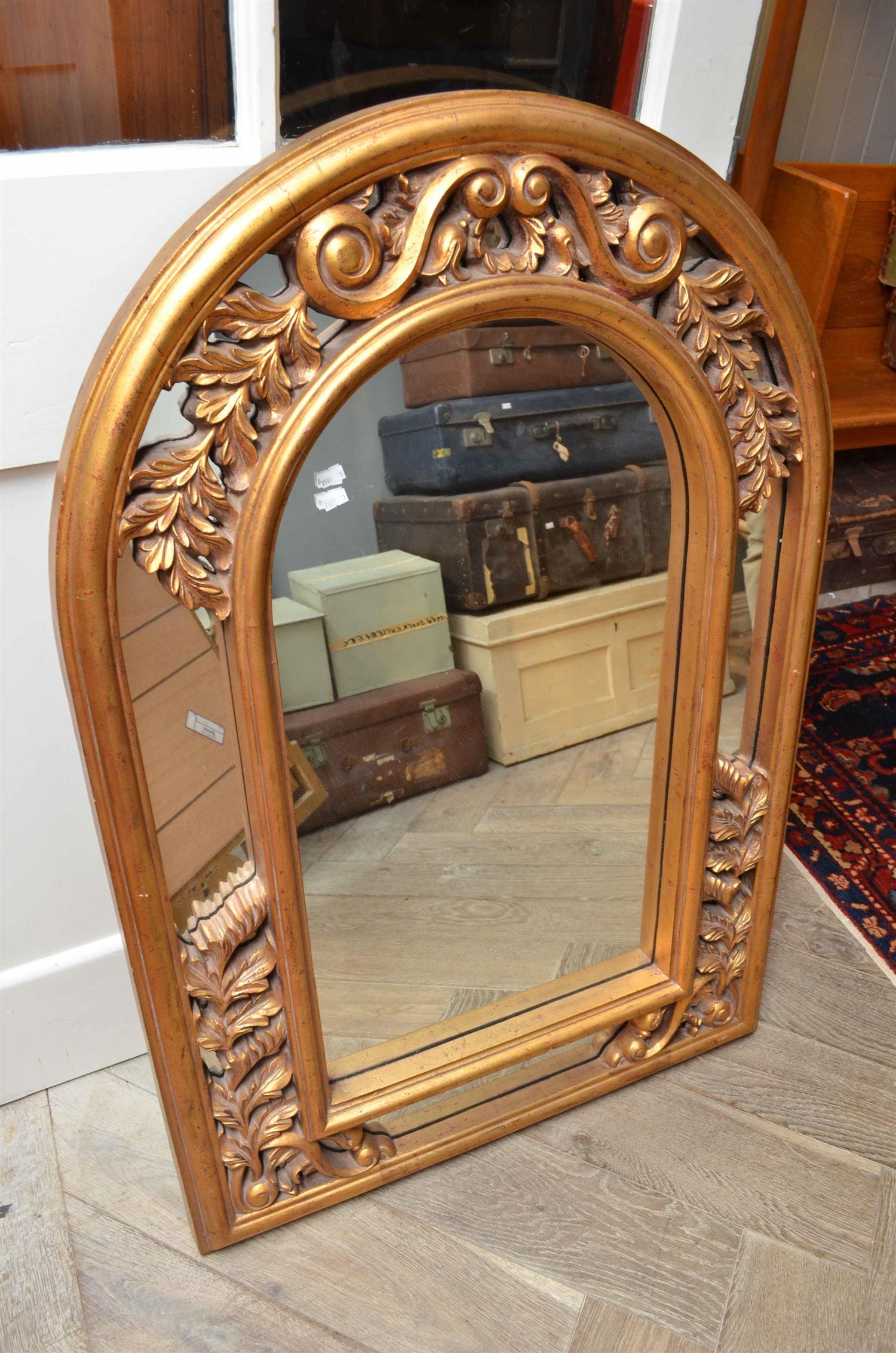 A LARGE GILT WOODEN FRAMED MIRROR WITH ROUNDED TOP