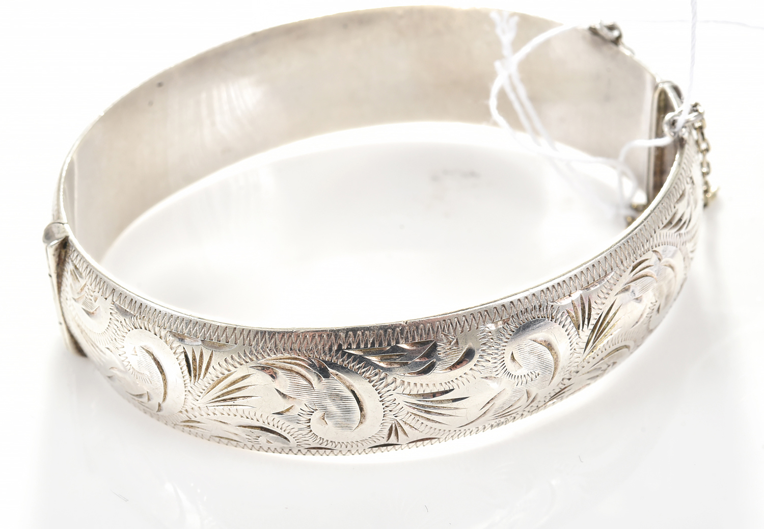 AN ENGRAVED HINGED BANGLE IN SILVER