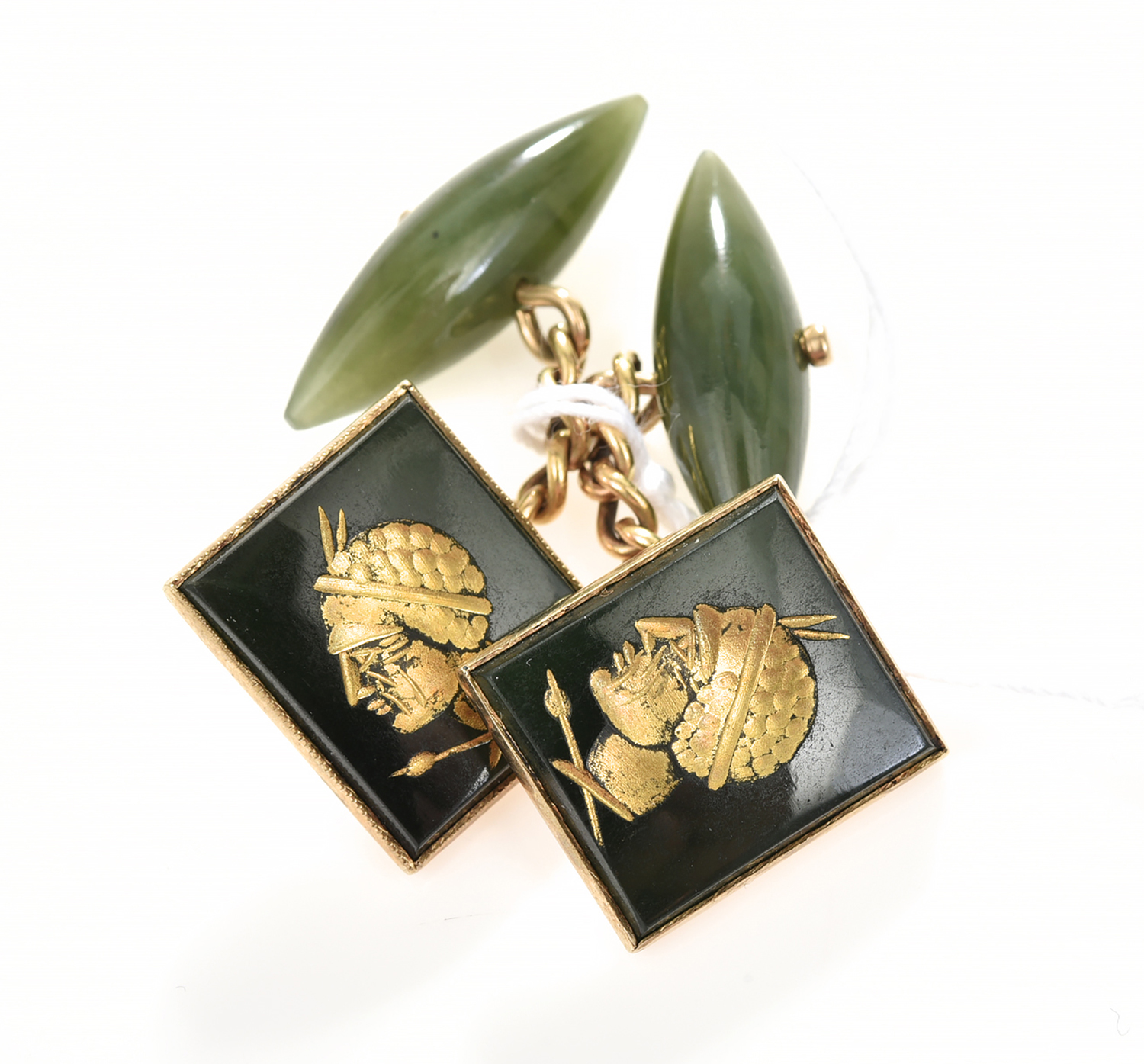 A PAIR OF NEW ZEALAND GREEN STONE CUFFLINKS WITH CARVED MAORI DESIGN