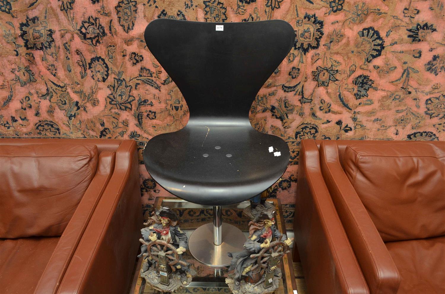 A 1980'S FRITZ HANSEN BLACK SINGLE CHAIR (BASE PLINTH LIFTS TO BE SCREWED TO FLOOR)