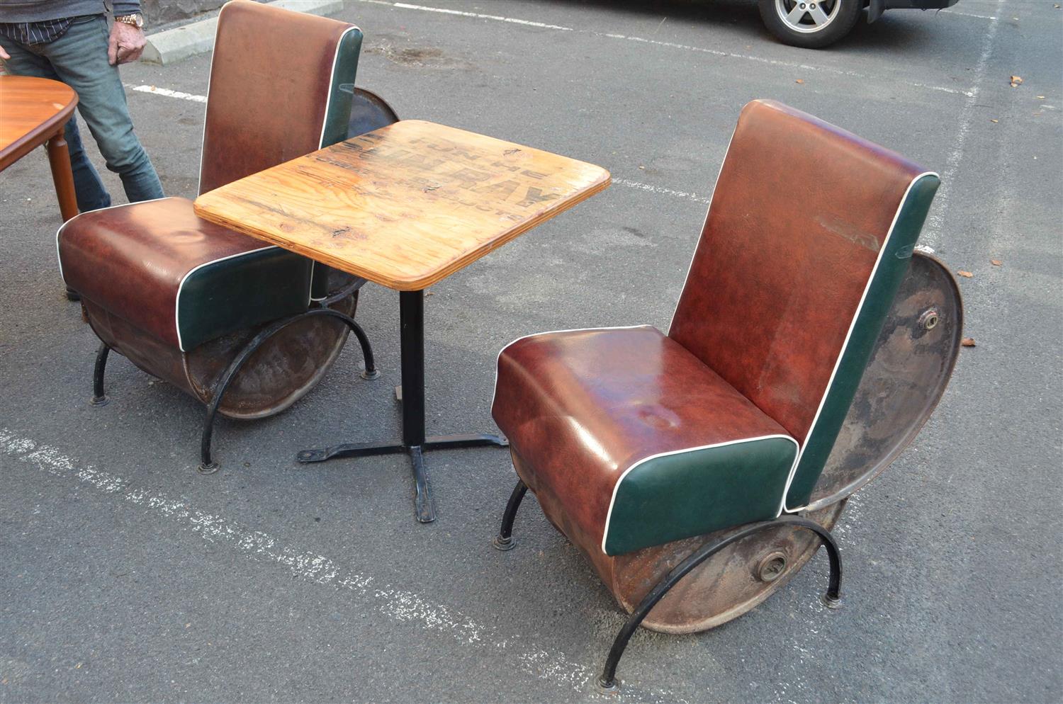 A PAIR OF RETRO EX COMMER BUS AIR SEATS WITH CENTRE TABLE WITH PACKING CASE TIMBER TOP