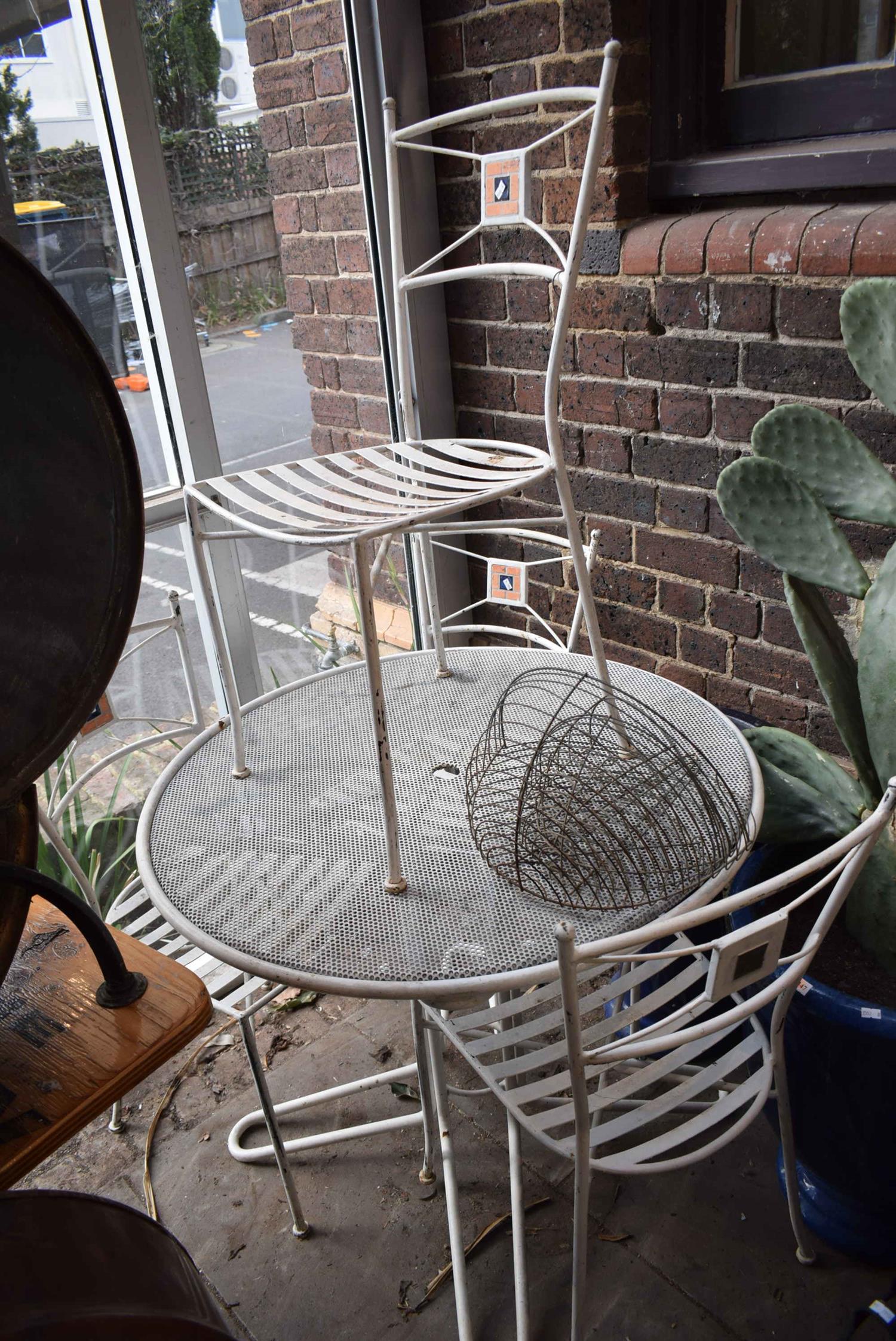 A FIVE PIECE WROUGHT IRON GARDEN SETTING