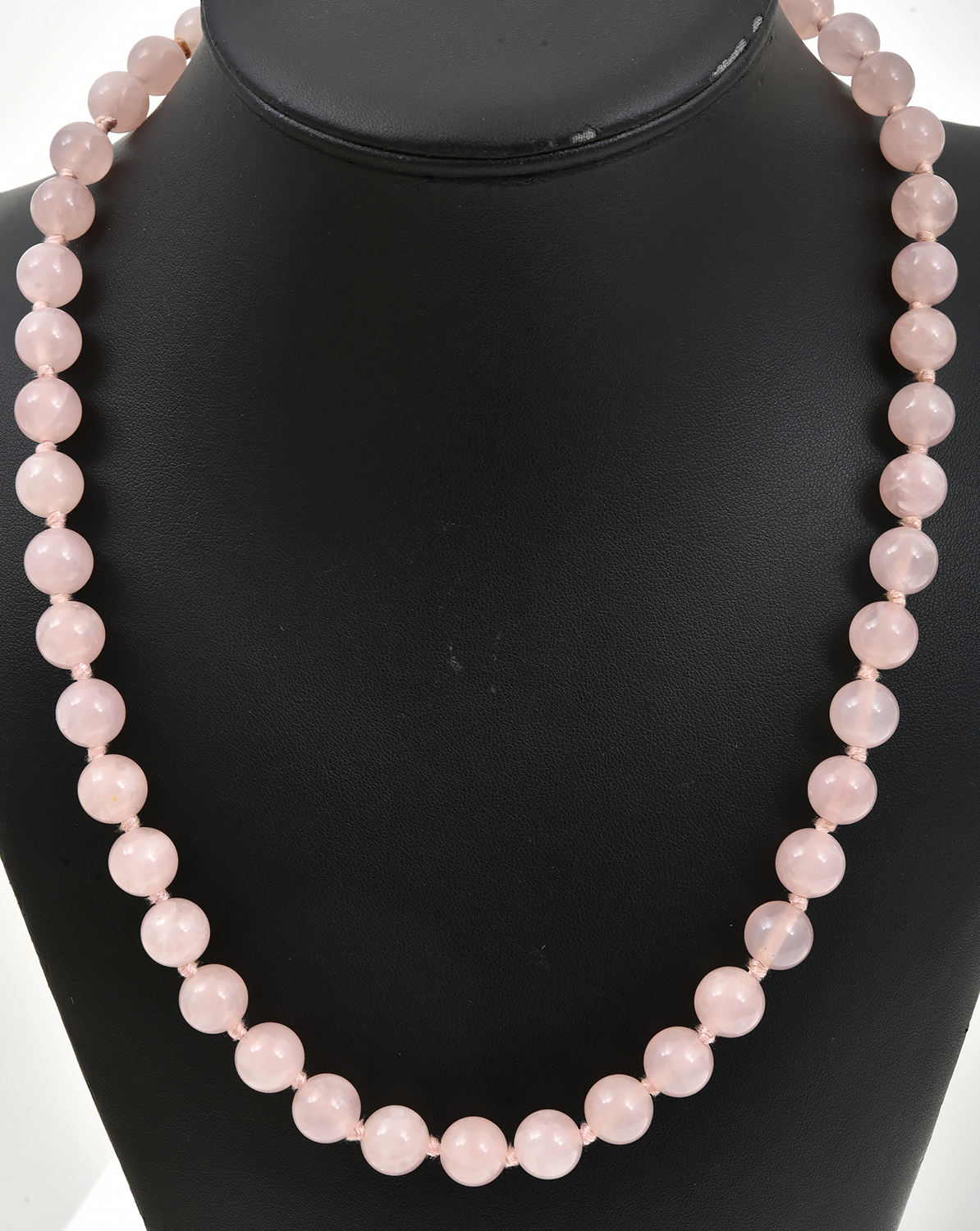 A STRAND OF ROSE QUARTZ BEADS TO A SILVER GILDED CLASP