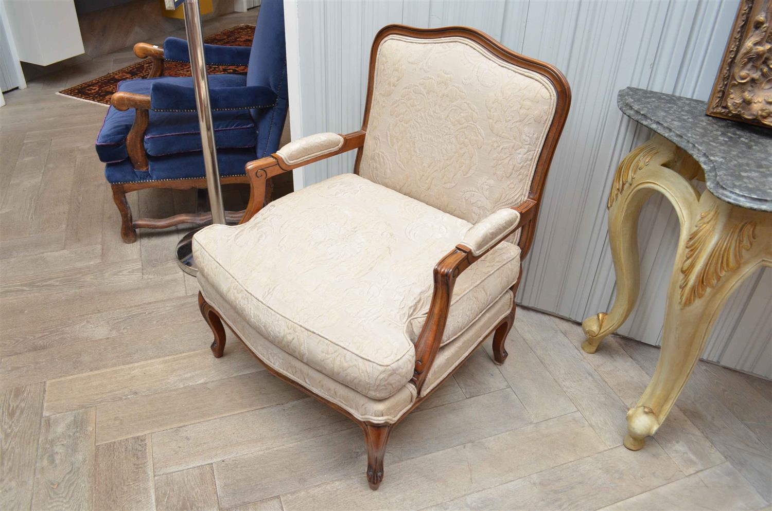 A PROVINCIAL STYLE ARMCHAIR IN LIGHT BROWN UPHOLSTERY
