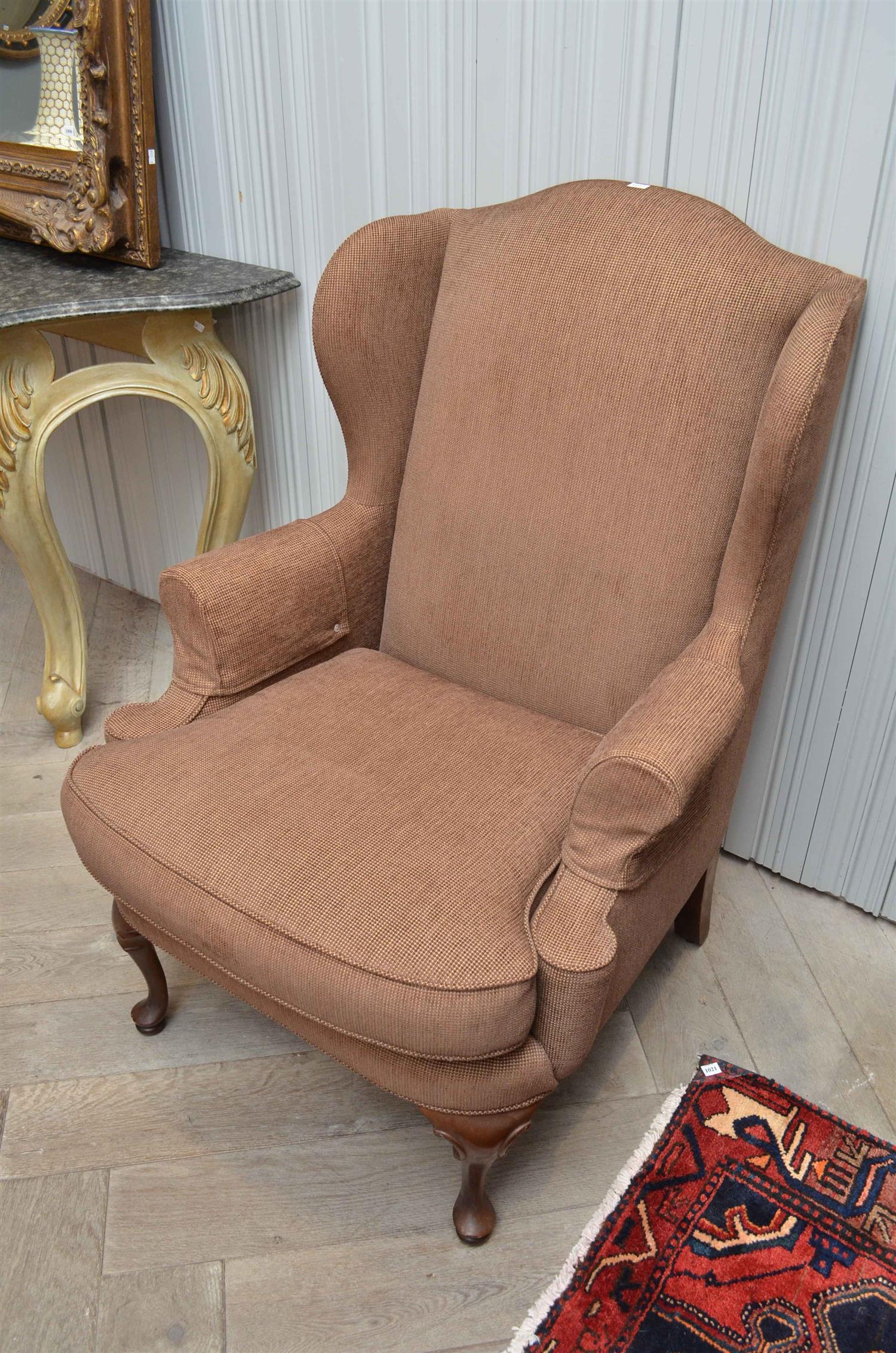 A GEORGIAN STYLE WINGBACK ARMCHAIR WITH CABRIOLE LEGS